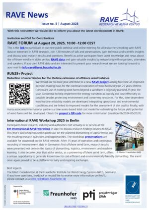 With our newsletters we would like to inform you regularly about news in alpha ventus, about offshore topics and about current or future RAVE projects. We also publish information about publications and interesting events such as our public RAVE FORA and annual International RAVE Workshops.